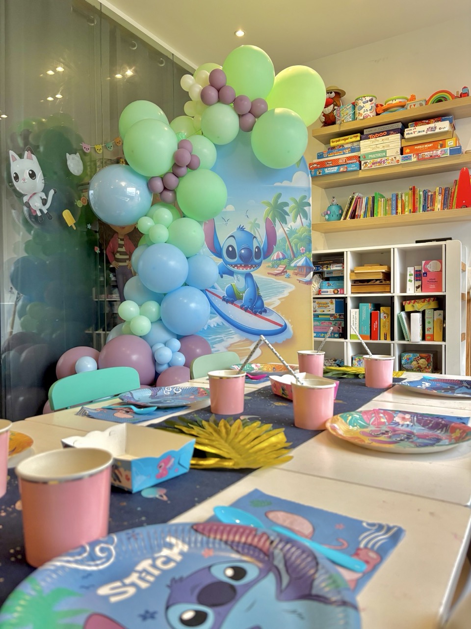 Décoration de la salle sur le thème Stitch avec les assiettes, gobelets, serviettes, guirlande, couverts et pailles et éléments décoratifs aux couleurs tropicales et intergalactiques.